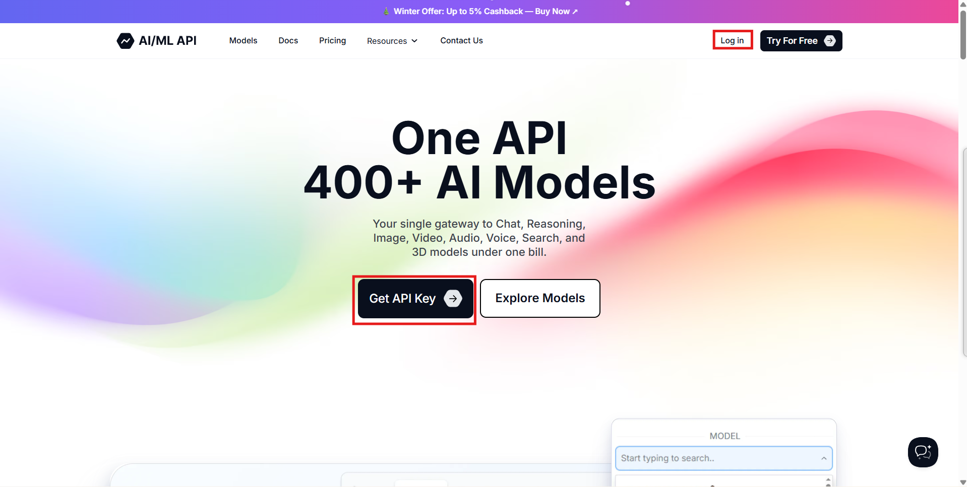 On the main page aimlapi.com click Log in, Try For Free or Get API Key