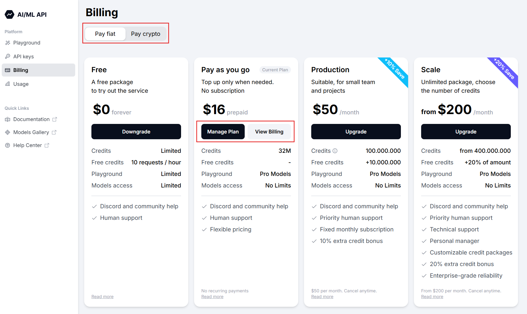 - Payment Method Selection: You can choose between credit card payments or cryptocurrency payments.