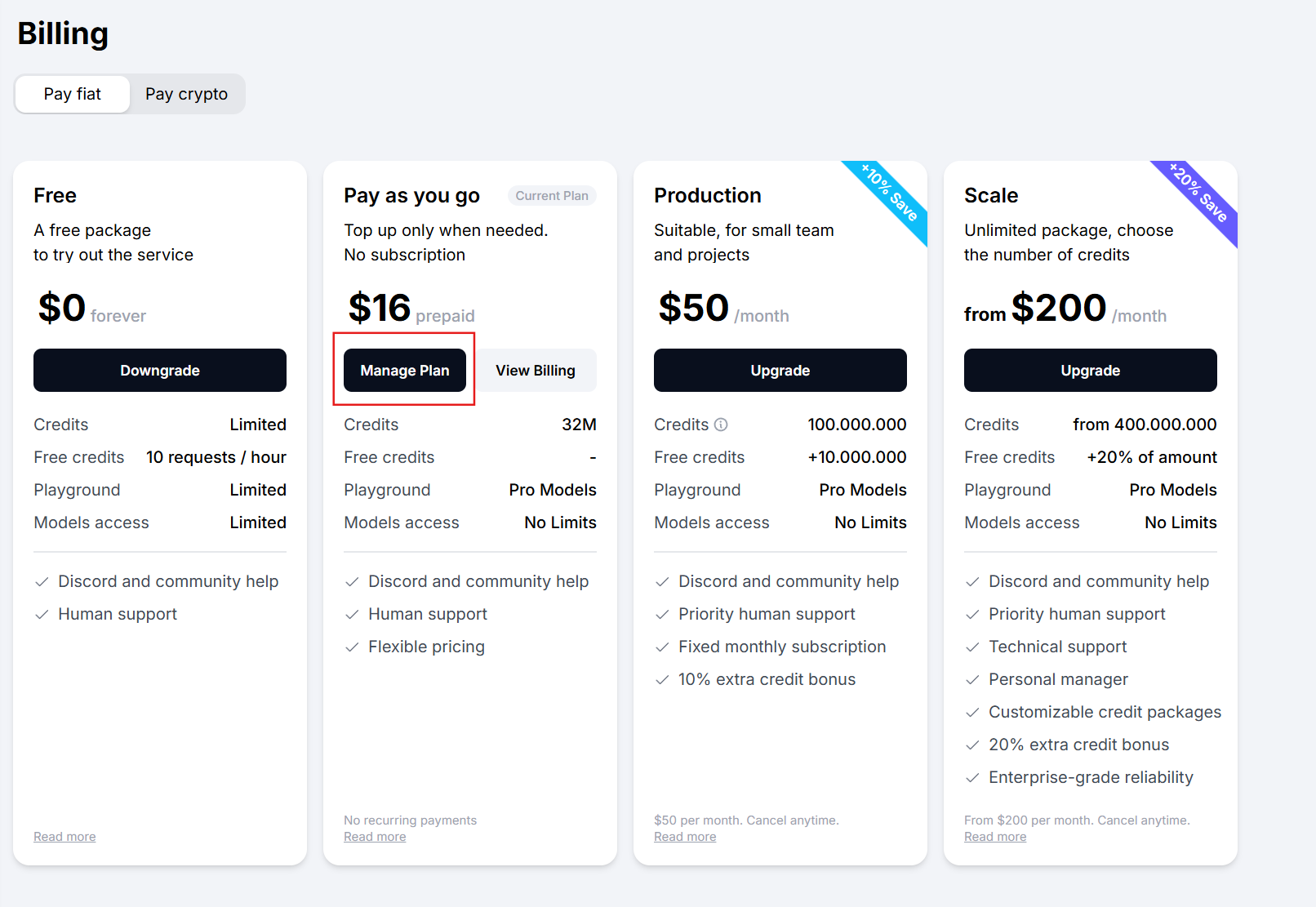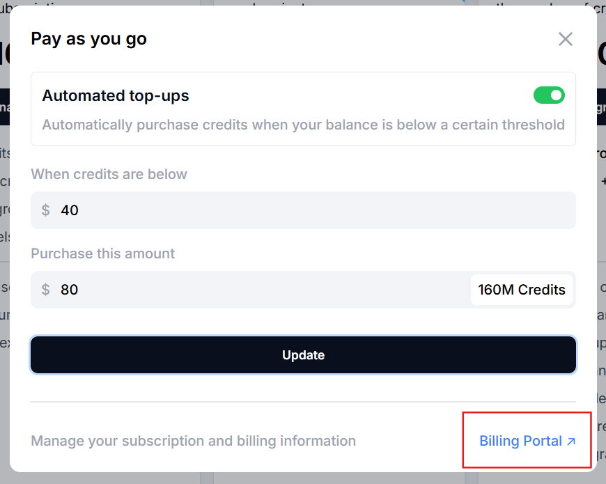 Go to your plan. Click Manage Plan. If you are on the Developer plan, click Top up under Pay as you go instead.